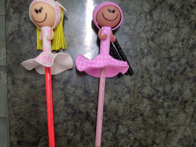 Essas bonecas são feitas de eva e biscuit, são colocadas na ponta de lápis ou caneta, foram feitas por minha amiga Alessandra, ela mora em Iabuna na Bahia. Se algúem se interessar posso mandar o passo a passo , ela aceita encomendas.