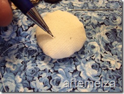 6 – Passe o cabo da flor pelo meio do retângulo (ainda pelo avesso). Em seguida use a agulha e linha para alinhavar o tecido e prendê-lo abaixo da bola de isopor;